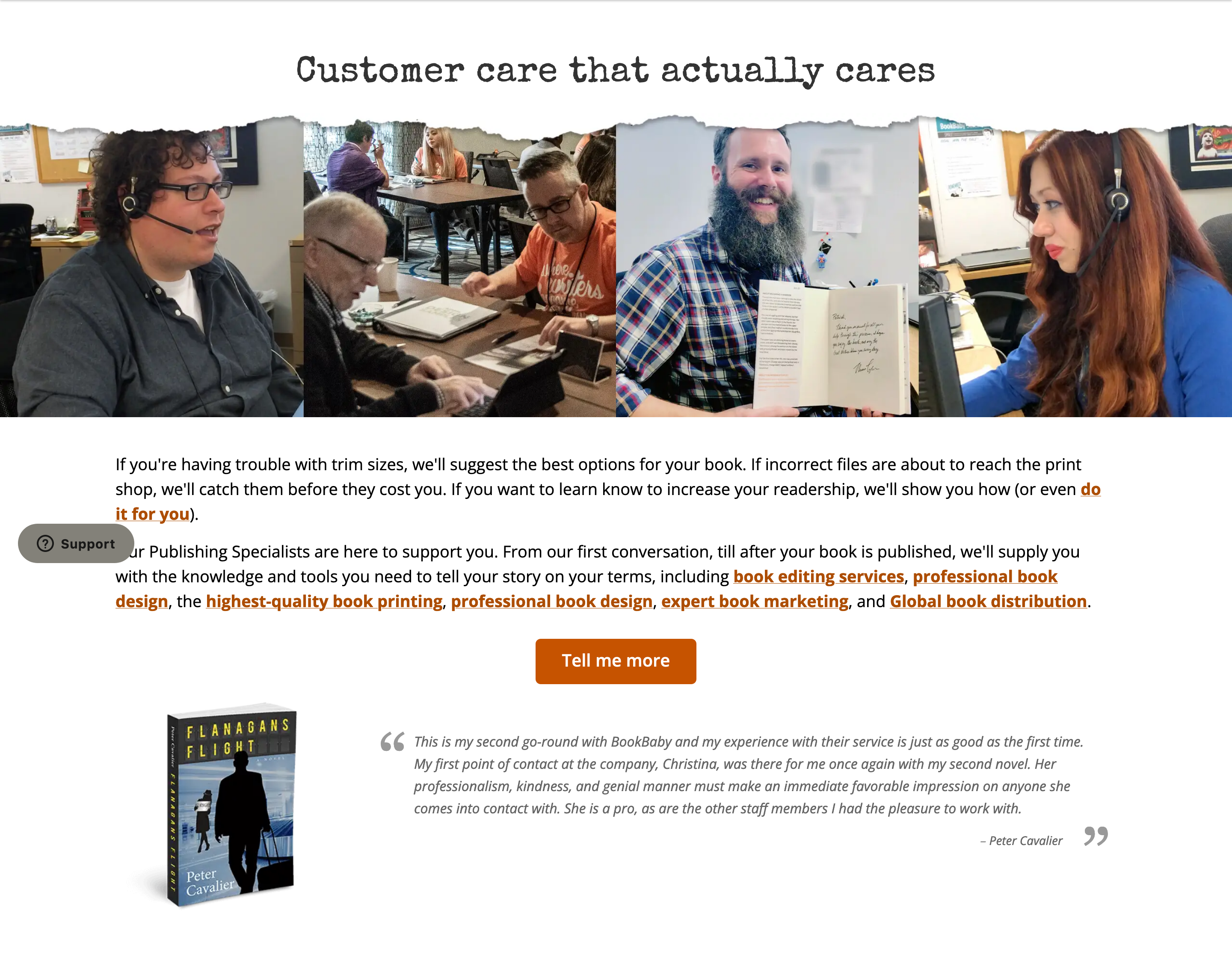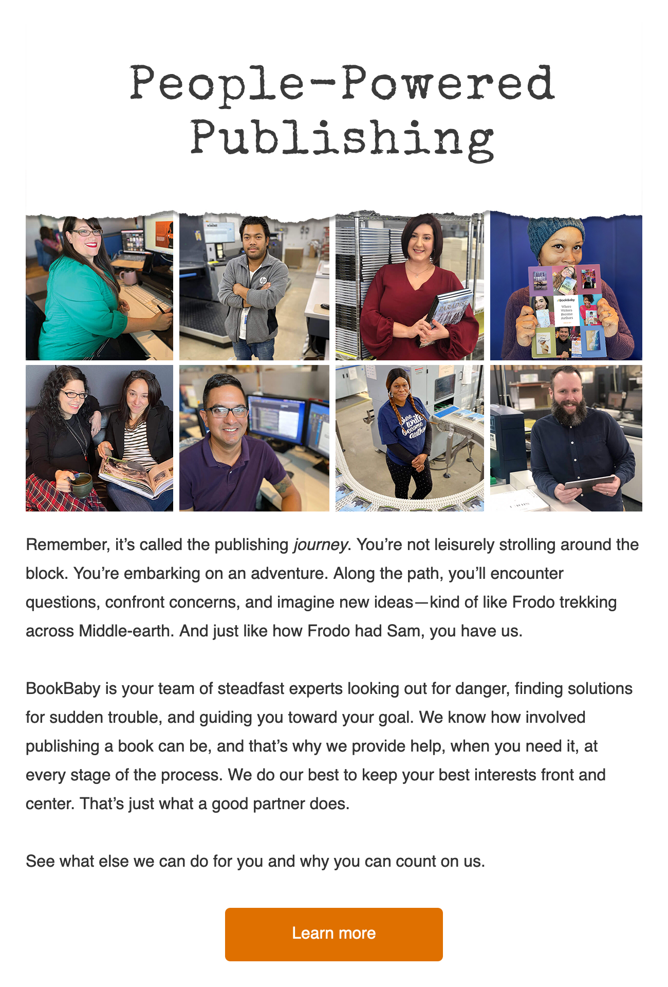 Many aspiring authors don't know where to start. Others are afraid to finish due to bad experiences with past publishers. So we made an integrated campaign to build trust between BookBaby and its audience. We grabbed attention with social ads, which led to a dedicated landing page empowering authors to finish their books. Supplemental assets include a house list email and a print ad in Publisher's Weekly.
